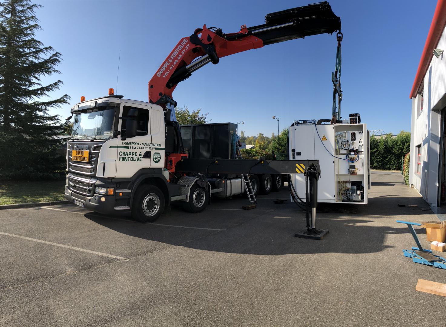 Chargement d'une chaudière sur camion plateaux avec un bras de grue de 105 t/m en autonomie complète